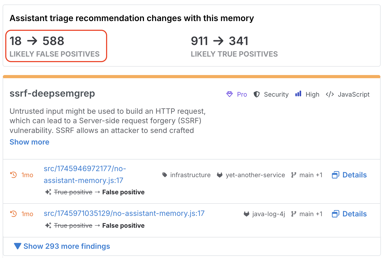 In this example, Semgrep suggests a memory scoped to a specific rule that’s returning too many findings. Without this memory, Assistant is only able to identify 18 false positives – but with the memory turned on, Assistant is able to filter out 588 false positives.