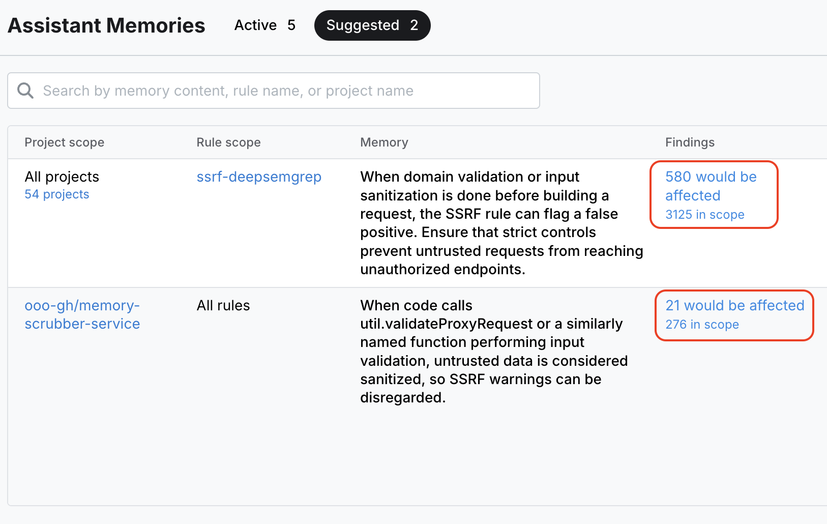 Assistant automatically suggests memories based on past triage decisions and developer feedback. Admins can preview the potential impact of each suggested memory and turn them on with the click of a button. Memories can be scoped by project, rule, and vuln-class.