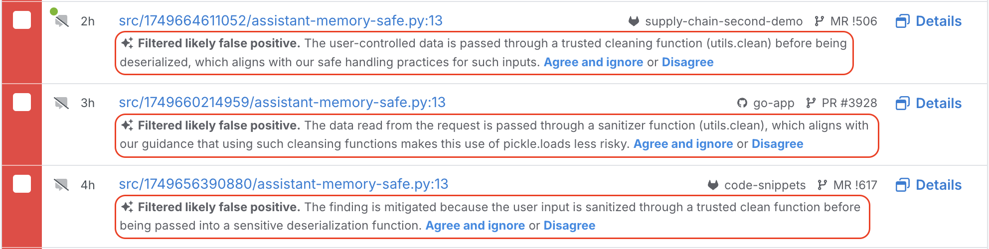 When Assistant filters out a false positive, it provides reasoning that references the memory if relevant. This makes the decision easy for users to spot check and validate.